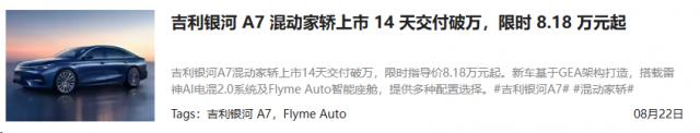 在上市后的一周,银河 A7 交付 4195 辆,超越了比亚迪秦 L,上市 14 天交付破万。