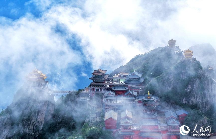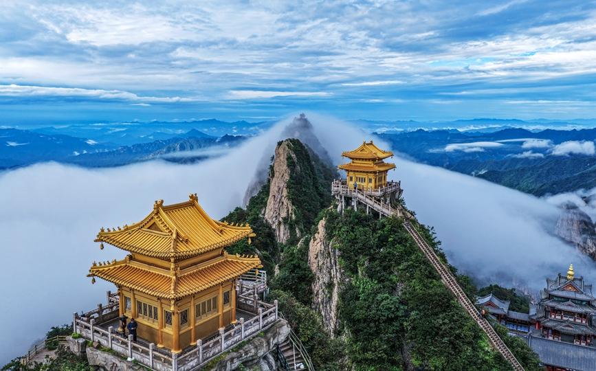 人民网洛阳9月12日电 (记者王玉兴)一场秋雨过后,河南老君山迎来绝美云海景观。山峦间云雾如轻纱翻涌缭绕,山巅的金顶建筑与古朴殿宇在云海中若隐若现,飞檐翘角与青翠崖壁、层叠远山相映,恍若神话仙宫落于人间。山间栈道蜿蜒入云,更添“天路通仙境”的意境。游客纷纷举起相机,按动快门,定格下“云海拥金阙”的震撼盛景,尽显大自然与人文建筑交融之美。