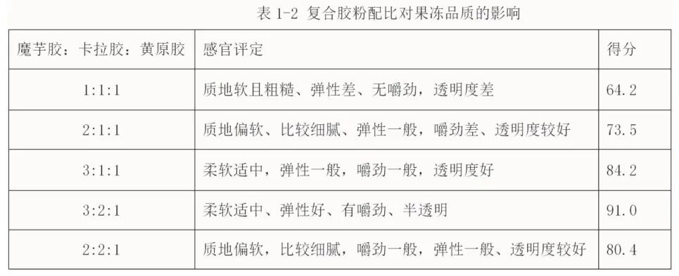 当魔芋胶、卡拉胶和黄原胶分别按照3:2:1的比例混合,果冻的感官评价最好,不仅弹性好,柔软适中还有嚼劲。而其他配比下的果冻质地、弹性嚼劲方面都会略差一些。