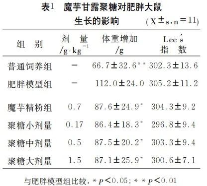 实验结果显示,魔芋甘露聚糖(0.17~1.5g/kg)可降低营养性肥胖大鼠的体重,减少脂肪堆积、脂肪细胞的数量和大小,可使肥胖大鼠的甘油三酯、高密度脂蛋白、血糖有所降低。