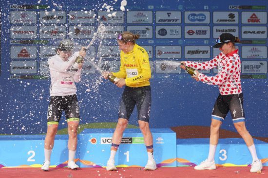 10月15日,身着黄衫的阿联酋ADQ车队车手范·罗延·索菲(中)、身着白衫的BTC城市卢布雅尔那队车手伊丽莎白·斯克利娅罗娃(左)、身着圆点衫的瓦尔克韦塞尔斯车队车手安妮·克妮珍宝在颁奖仪式上庆祝。新华社记者 王翔 摄