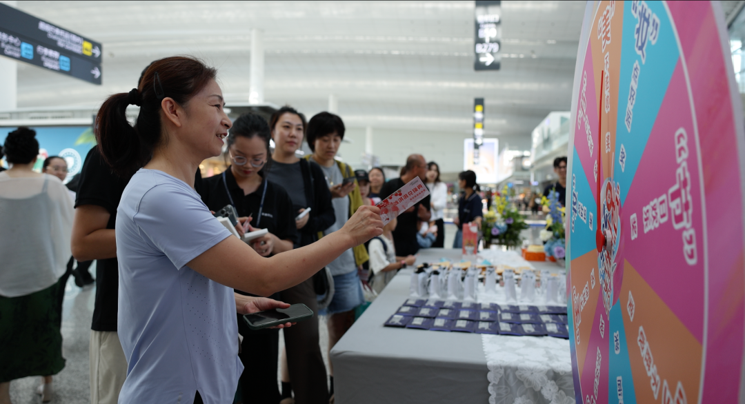 开幕现场设置14个主题展台,覆盖香氛、科技美妆、健康养生等领域。其中,美妆互动彩车、AI机器时代科技展区等成为人气打卡点,为旅客带来沉浸式、科技感十足的互动体验。同时,机场通会员专属抽奖活动同步上线,丰富精美的礼品进一步增强了活动吸引力,让旅客在参与中收获惊喜。